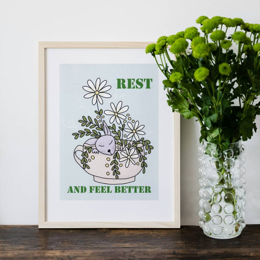 Welcome a moment of calm into your world with this tender illustration of a kangaroo joey sleeping peacefully in a teacup garden. Comforting nature‑inspired art that softens any space. A sweet Australian touch for your home.